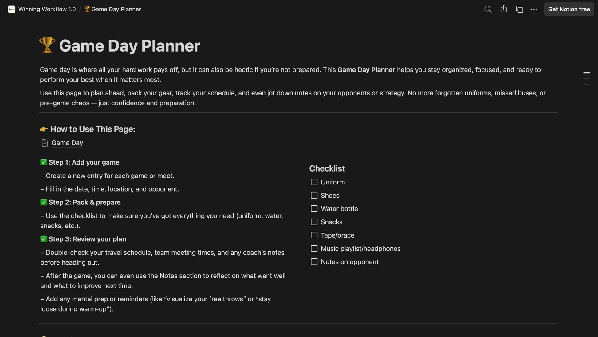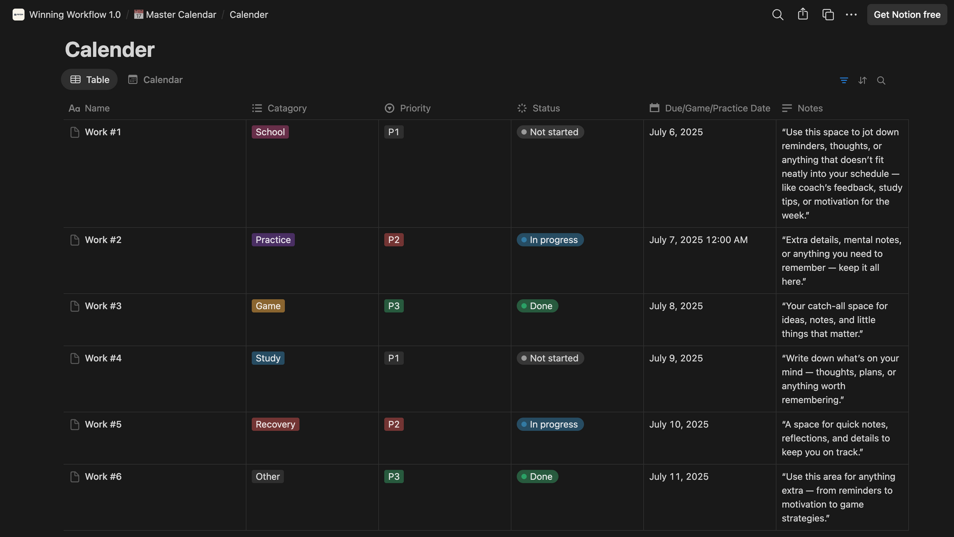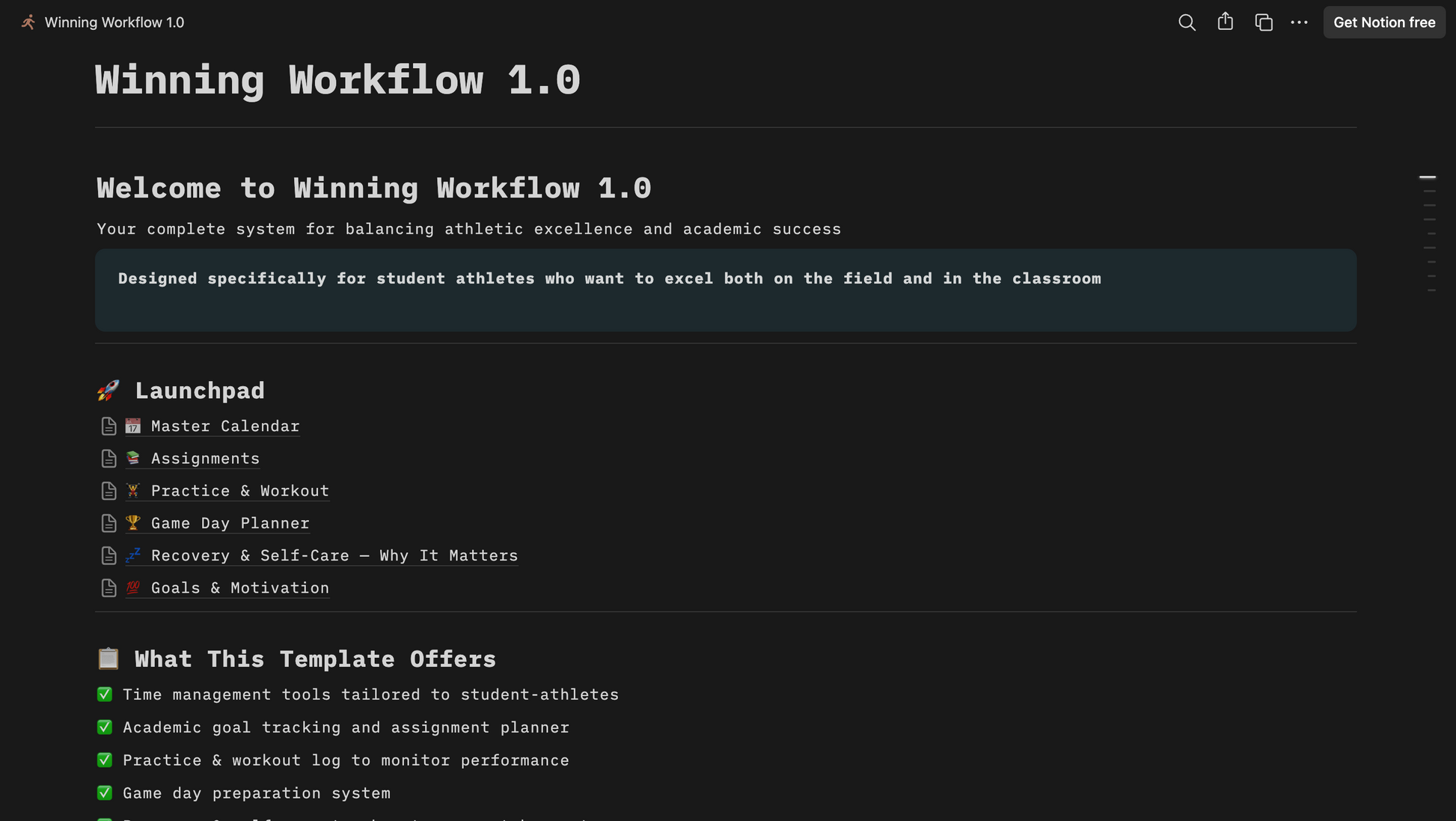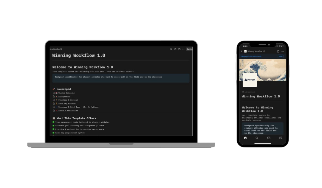 Balancing academics and athletics is challenging, but this Notion template makes it simple. Designed specifically for student-athletes, it helps you bring order to the chaos by combining your schoolwork, practices, games, and personal life into one clear, easy-to-use system. With a unified calendar, you can track assignments, practices, games, and events all in one place. The academic tracker keeps you on top of tasks, deadlines, and your GPA, while the workout and recovery log helps you monitor your training sessions, progress, and rest days. A dedicated game day checklist ensures you’re always prepared to perform, and the goal-setting section keeps you motivated and focused throughout the season.
