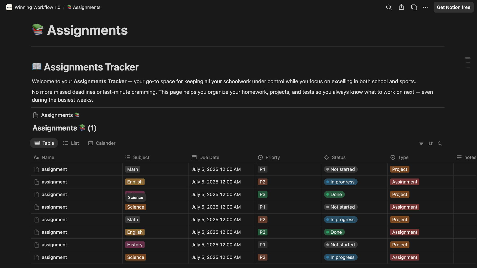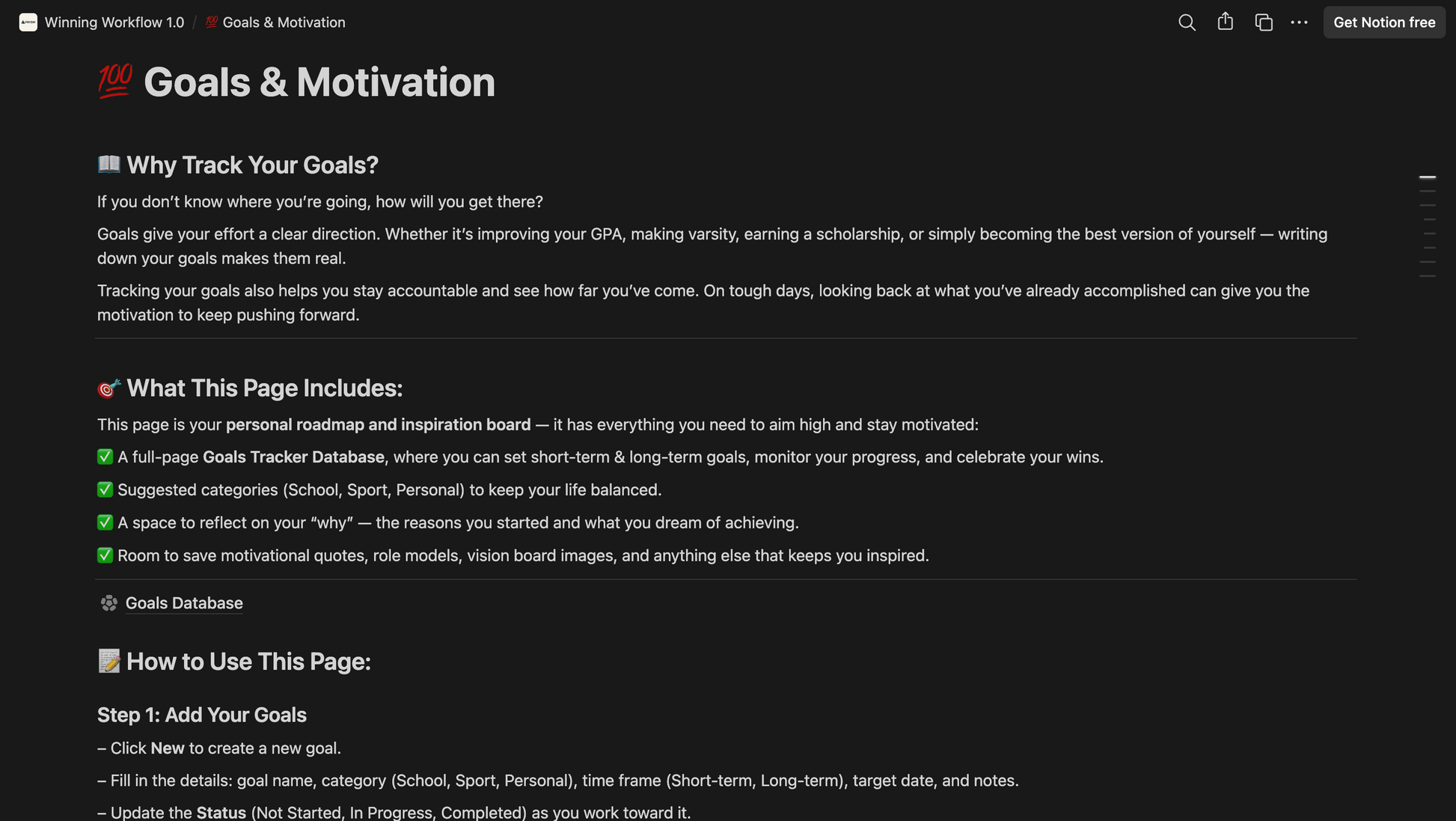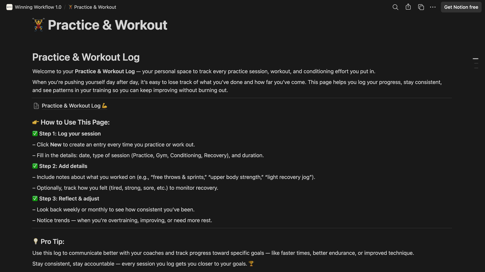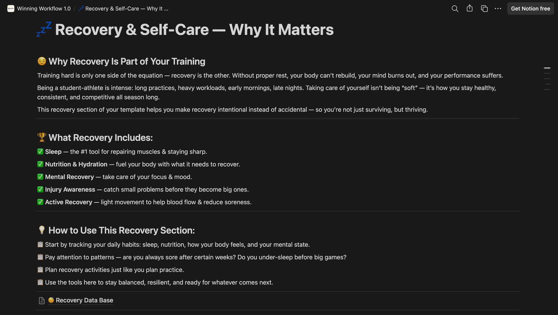 Balancing academics and athletics is challenging, but this Notion template makes it simple. Designed specifically for student-athletes, it helps you bring order to the chaos by combining your schoolwork, practices, games, and personal life into one clear, easy-to-use system. With a unified calendar, you can track assignments, practices, games, and events all in one place. The academic tracker keeps you on top of tasks, deadlines, and your GPA, while the workout and recovery log helps you monitor your training sessions, progress, and rest days. A dedicated game day checklist ensures you’re always prepared to perform, and the goal-setting section keeps you motivated and focused throughout the season.